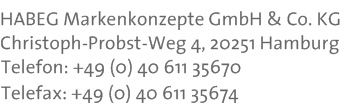 Impressum Steuernummer: 43 626 00982 | Texte & Bildmaterial sind Eigentum von Torsten Hauschild. Vervielfältigen sowie kopieren ist nicht gestattet! | Inhaltlich verantwortlich gemäß § 6 MDStV: Torsten Hauschild HABEG Markenkonzepte GmbH & Co. KG, Rechtsform: GmbH & Co. KG, Sitz: Hamburg, eingetragen im Registergericht des AG Hamburg unter HRA 112613 Persönlich haftende, geschäftsführende Gesellschafterin: HABEG Markenkonzepte Verwaltungsgesellschaft mbH, Rechtsform: GmbH Sitz: Hamburg, eingetragen im Registergericht AG Hamburg unter der HRB 116656, Geschäftsführer Torsten Hauschild. |